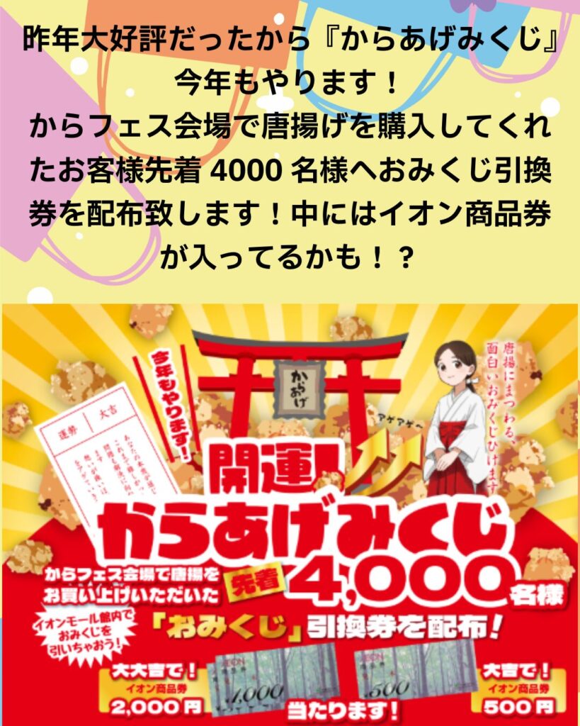 からあげ購入者、先着4000名様限定の「からあげみくじ」。おみくじはイオンモール三光内2階のおみくじ会場です!たくさんのご来場お待ちしております。